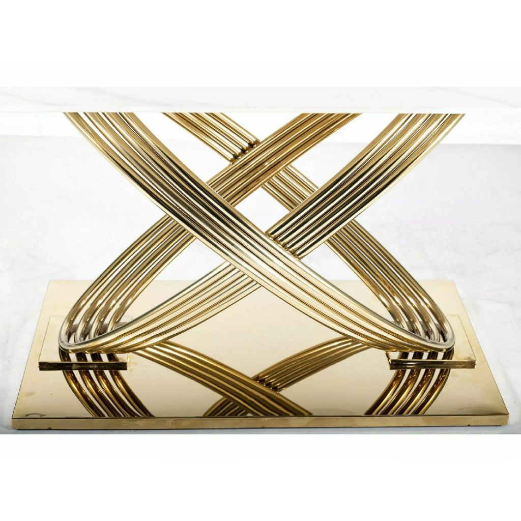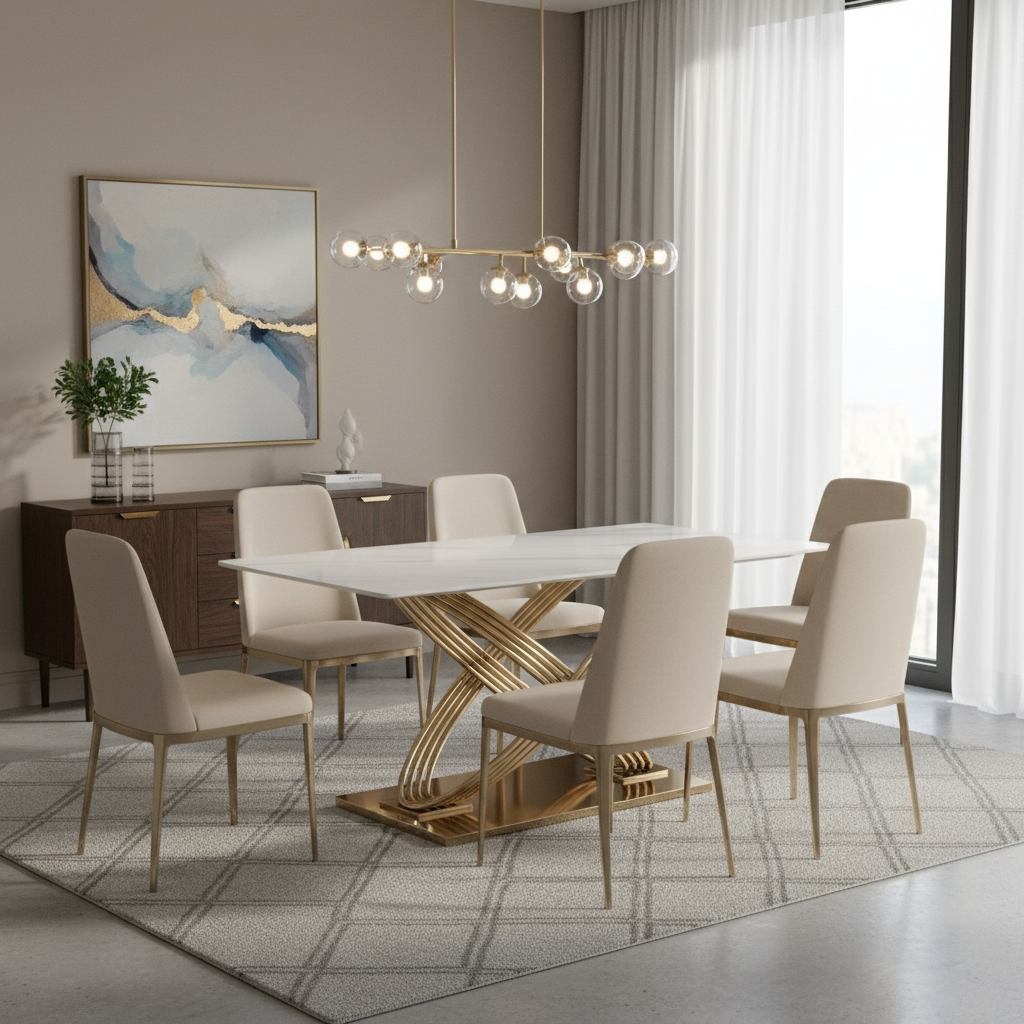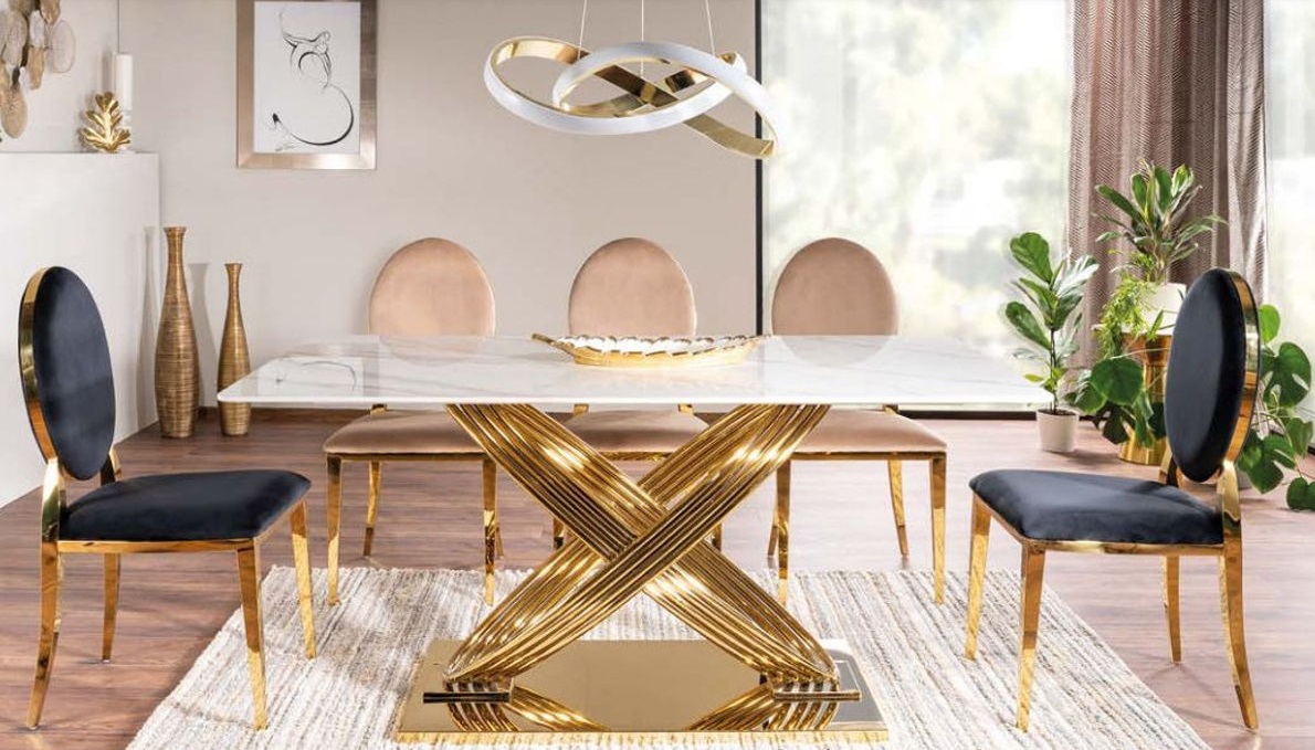 Nadčasový jedálenský stôl HERMES s unikátnymi zlatými nohami a elegantnou keramickou doskou je pre vás správnou voľbou. Doska jedálenského stola nie je len nádherná na pohľad, ale aj praktická. Je odolná voči poškriabaniu a ľahko sa čistí, čo z neho robí ideálnu voľbu pre každodenné používanie. Nádherný jedálenský stôl HERMES nie je len miestom, kde sa stretnete s rodinou a priateľmi, ale aj skutočným umeleckým dielom, ktoré zdobí vašu jedáleň. Stôl je dodávaný v demonte.