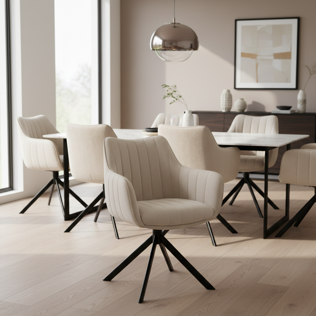 Stolička AZALIA je návrhom univerzálnej stoličky. Tento model bol čalúnený kvalitnou zamatovou tkaninou so zaujímavým prešívaním, jej sedadlo je tiež mäkké a pohodlné a lakťové opierky poskytujú väčší komfort. Kovová konštrukcia je stabilná, lakovaná čiernou matnou farbou. Stolička AZALIA má veľmi jedinečnú výhodu, ktorou je schopnosť otáčania až o 180°. Perfektne sa hodí do moderného interiéru, k stolu v kuchyni alebo v jedálni, ale môže byť aj pri pracovnom stole.