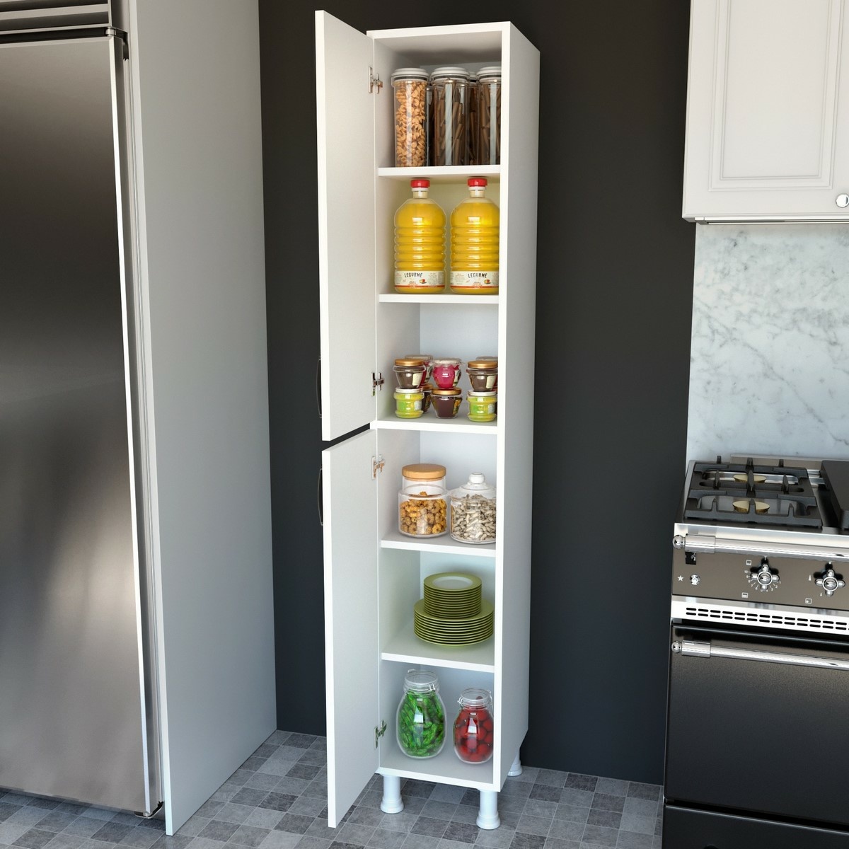 Skrinka Miny White je praktický a elegantný kus nábytku, ktorý poskytne prehľadné a organizované miesto na uloženie každodenných potrieb. Kombinuje uzavreté skrinky s vnútornými policami, takže ponúka variabilný úložný priestor vhodný do kuchyne, kúpeľne, predsiene aj spálne. Vďaka svojmu vysokému a úzkemu tvaru sa zmestí aj do menších miestností.