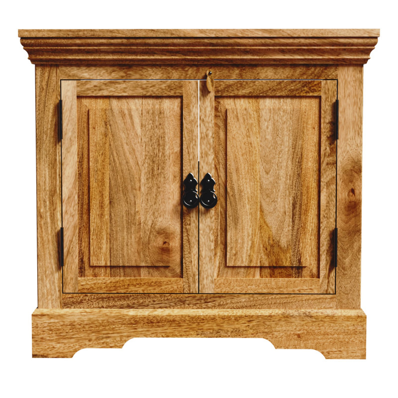 Skrinka pod umývadlo masív Guru je vyrobená z kvalitného masívu mango.Skrinka pod umývadlo z masívu má dve zásuvky a dvoje dvierka s úložným priestorom. Vyrobená z indického manga. Skrinky do kúpeľne z masívu, ktoré máme na sklade, si môžete pozrieť v našom showroome. Indický koloniálny nábytok mango masív.