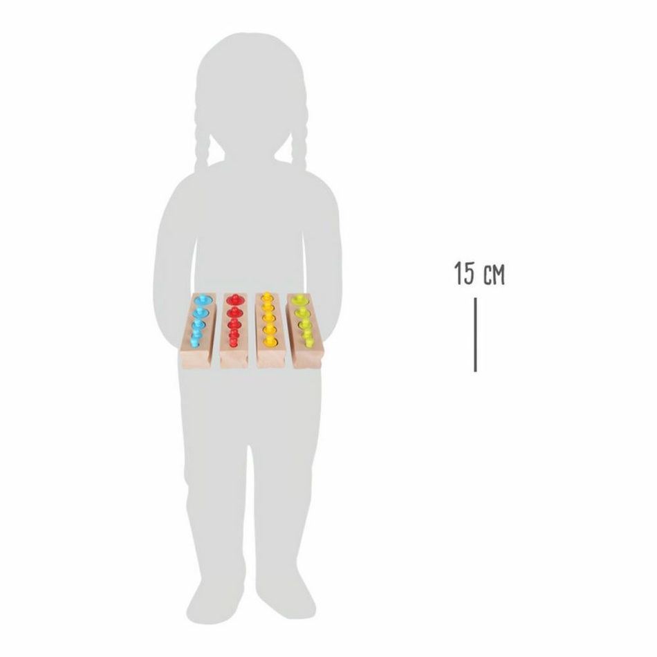 Táto pestrofarebná logická hra povzbudzuje deti k porovnávaniu, organizácii, počítaniu, meraniu a štruktúrovaniu. Táto hračka z masívneho dreva sa vyznačuje svojou jednoduchosťou a zreteľnosťou. Precvičuje jemnú motoriku a pomáha deťom v rozvoji ich vnímania, inteligencie a osobnosti.“Pomôžte mi to urobiť sám!“ je presne to, čo odporúča Montessori pedagogika!