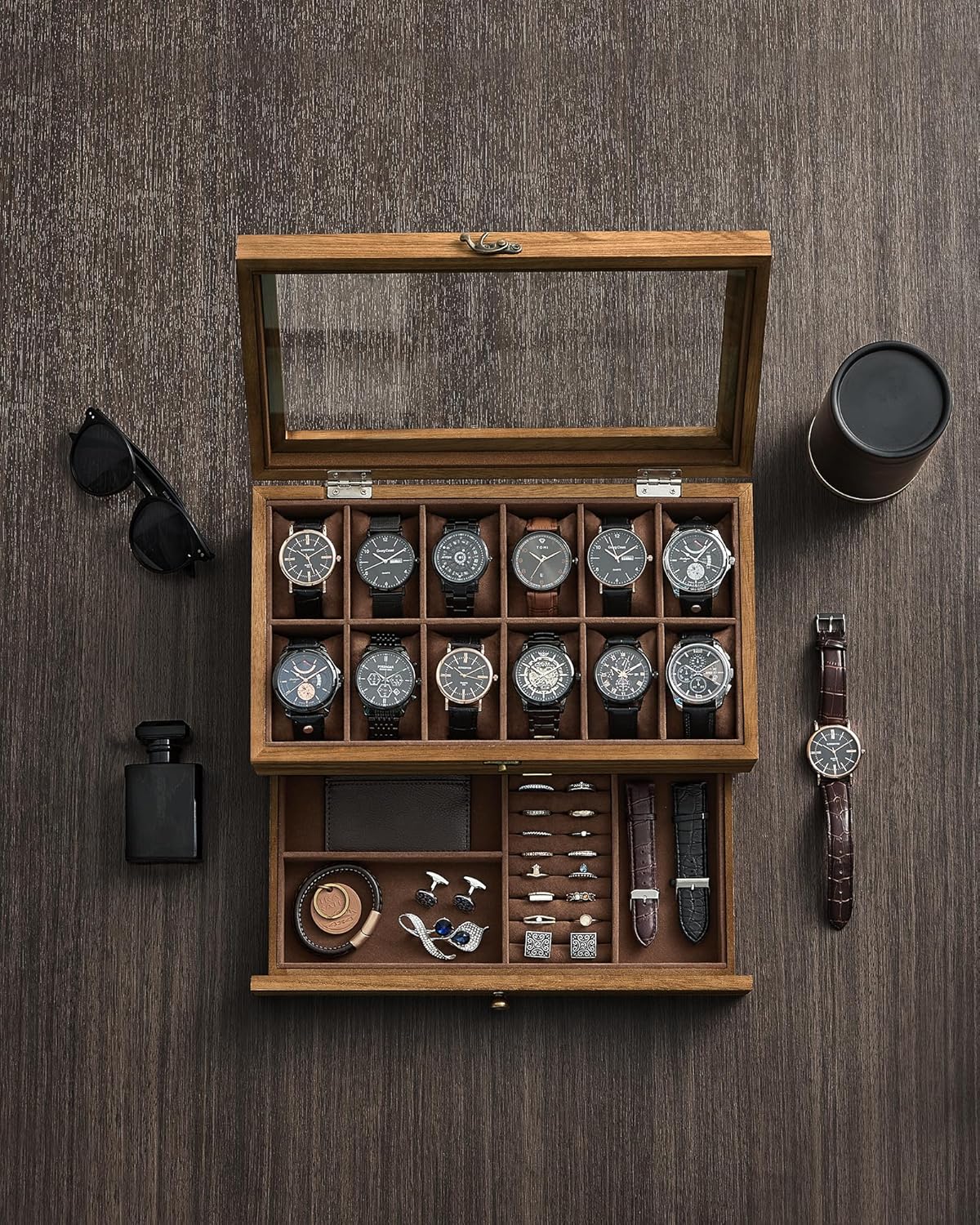 S 12 priehradkami na hodinky v prvej vrstve a rôznymi priehradkami v spodnej zásuvke na remienky, prstene a manžetové gombíky, táto dvojposchodová škatuľka na hodinky a šperky udrží všetko pekne usporiadané.