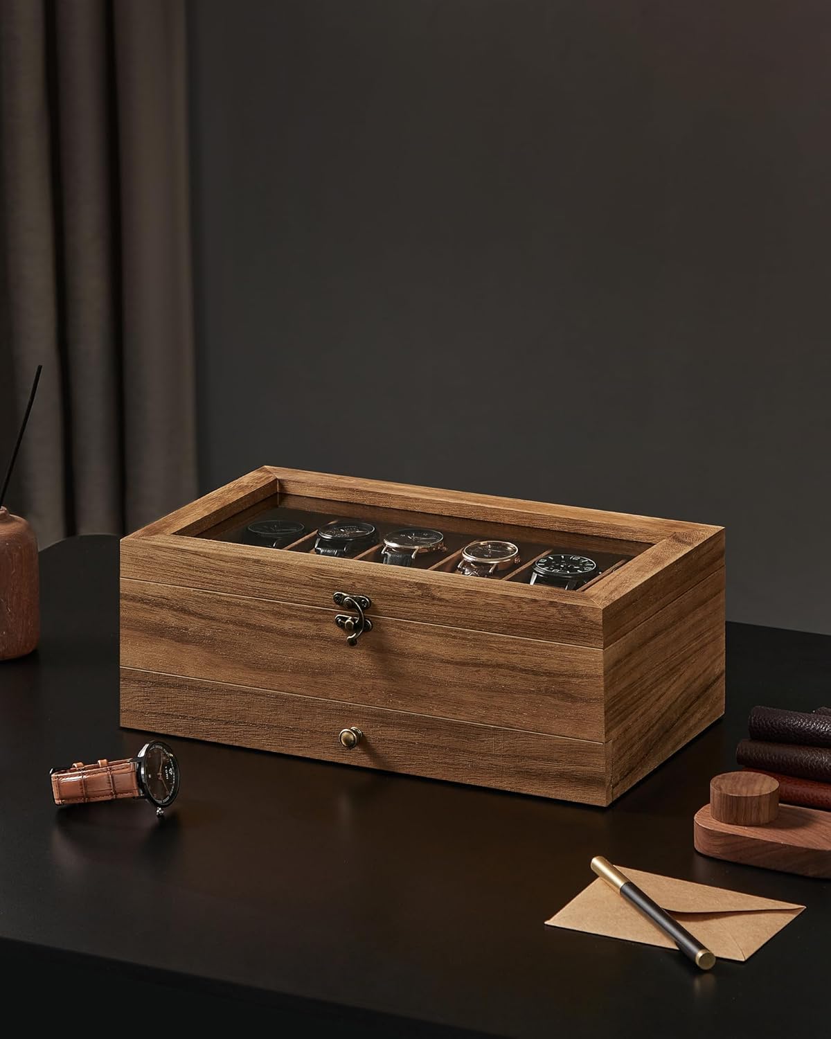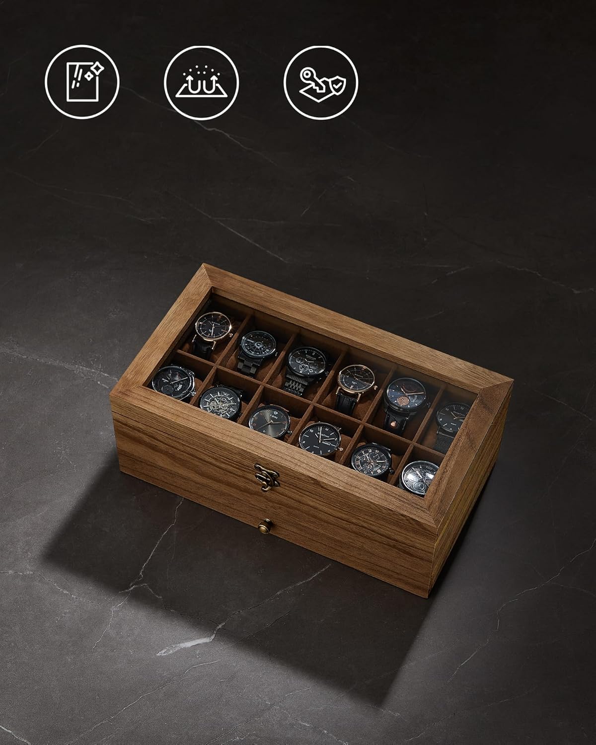 Škatuľka na hodinky má veľké priehľadné sklenené veko, takže môžete ukázať svoju kolekciu hodiniek, chrániť ju pred prachom a okamžite nájsť svoje obľúbené hodinky, čím ušetríte čas v hektických ránoch.