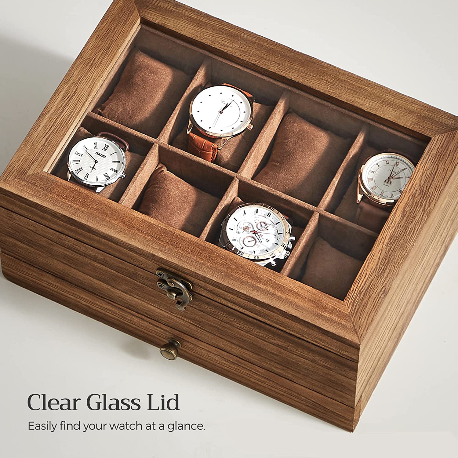 Cez sklo drevenej skrinky vidíte priehradky určené na uloženie hodiniek a pod nimi je zásuvka na šperky.