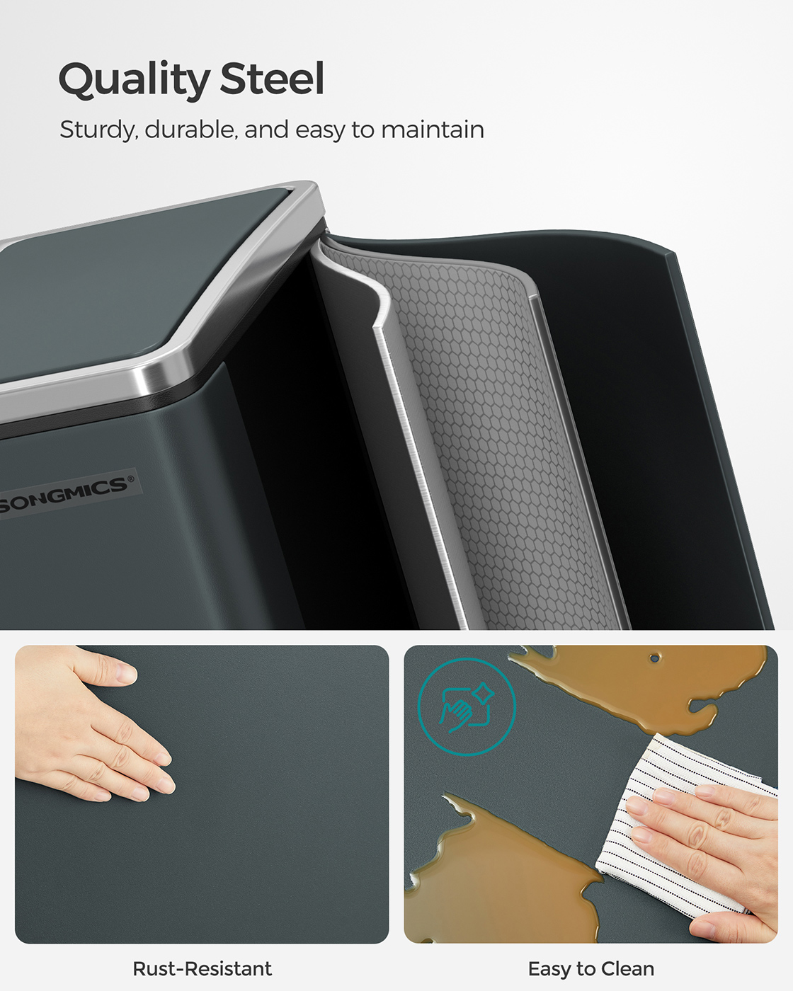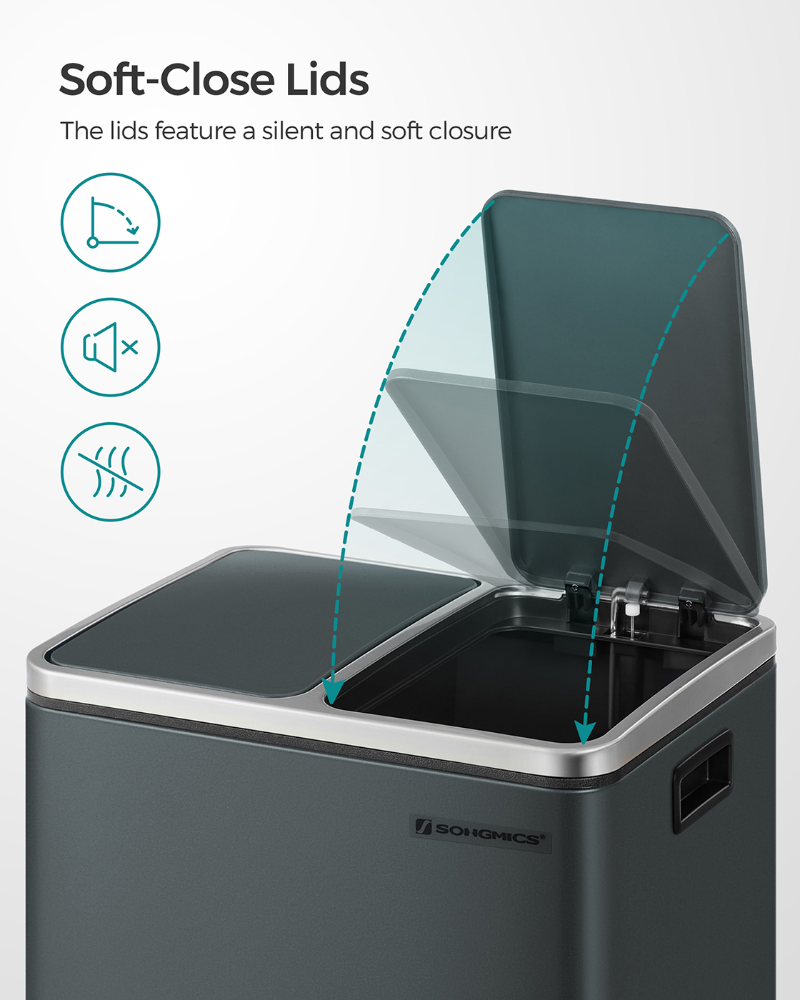 Každá z 2 priehradiek odpadkového koša má vyberateľnú vnútornú nádobu, pedál a veko, takže môžete priehradky otvárať a zatvárať samostatne a triediť odpad.