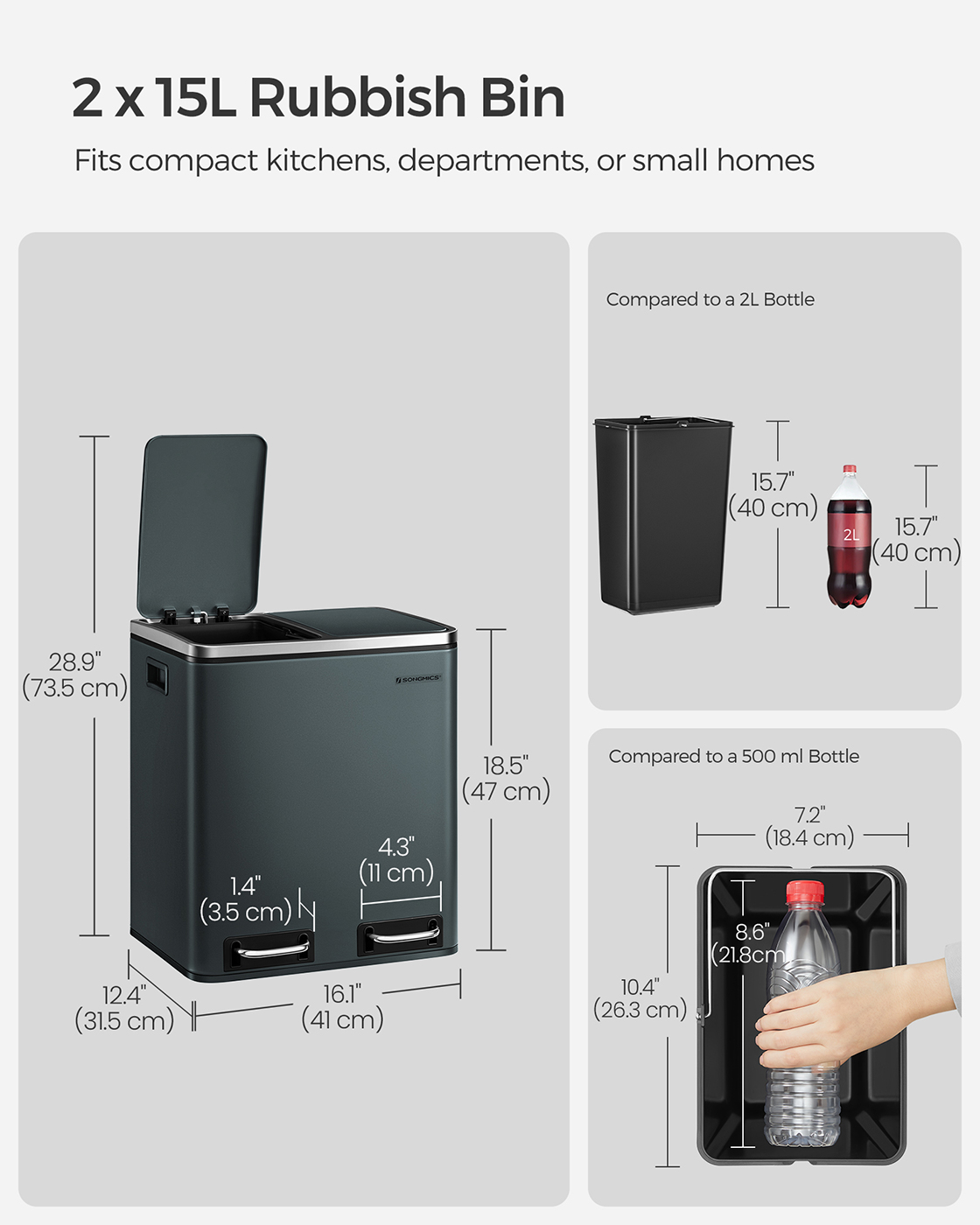 Kompaktný 15-litrový odpadkový kôš s dvoma priehradkami je ideálny do malých kuchýň, bytov alebo malých domov, kde môžete odkladať odpad, ako sú obaly a organický odpad, a ľahko ho triediť.