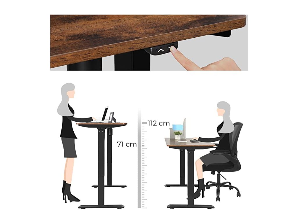 Pomocou jednoduchého ovládača na spodnej strane stola si nastavte výšku od 71 cm do 112 cm. Vďaka pevnému rámu má stôl nosnosť až 100 kg, takže sa nemusíte obávať jeho správneho zaťaženia.