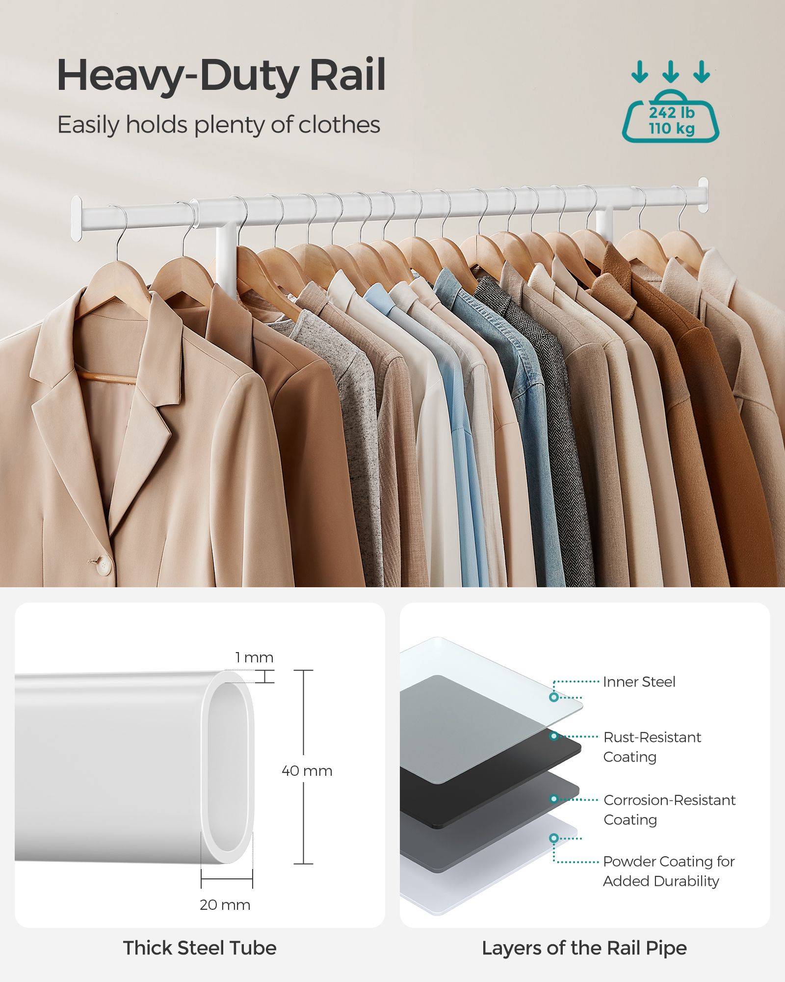 Díky ocelovým trubkám o tloušťce 1 mm, které jsou silnější a pevnější než běžné trubky o tloušťce 0,8 mm, a odolným PP kolečkům unese tento stojan na oblečení až 90 kg. Takže neváhejte a pověste na něj své těžké kabáty!