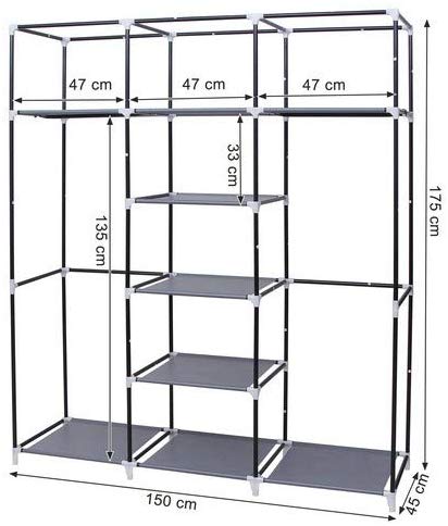 Výrobok obsahuje 2 závesné tyče na oblečenie a 9 odkladacích políc.