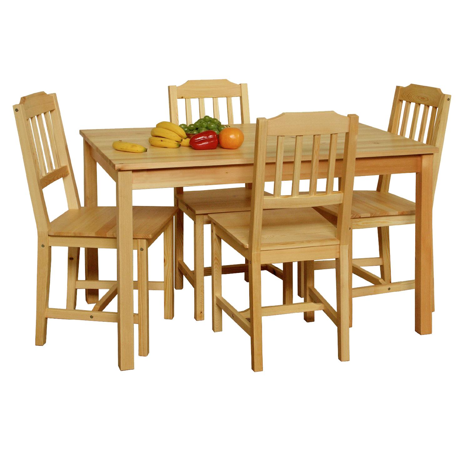 Stôl + 4 stoličky 8849 lak v prevedení masív borovica doplní priestor jedálne zariadenej masívnym nábytkom. Zostava obsahuje pevný stôl a 4 stoličky. Výška sedu stoličky je 45 cm. Rozmer stolu je 118 x 75 x 73 cm, rozmer stoličky je 41 x 42 x 86 cm. Zostava je vhodná i do menších priestorov.