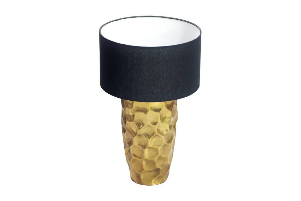 Čierne látkové tienidlo s kontrastným vnútrom elegantne dopĺňa zlatú základňu a zabezpečuje mäkké, neoslňujúce svetlo. Lampa je ideálna na vytvorenie útulnej atmosféry v obývačke, spálni alebo na nočnom stolíku.