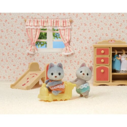 Sada Dvojičky Husky obsahuje figúrky bábätka Amber (sediacie) a Jeremyho (plazí sa) spolu s vozíkom (vláčik). Amber má sivú srsť a Jeremy hnedú. Na vozíku môže jazdiť ktorékoľvek z dvojčiat Husky (sediace alebo plaziace sa). Postavičky majú otočné hlavičky.Skombinujte s Rodinou Husky a sadou Tandemový bicykel pre Husky súrodencov (oboje sa predávajú samostatne) pre zábavu s celou Husky rodinou. Vozík môžete tiež pripojiť k saniam sady Rodina Husky alebo ku kočíkom iných dvojčiat (všetko sa predáva samostatne). Alebo ich skombinujte s ďalšími domami a nábytkom (predávajú sa samostatne) pre ešte zábavnejšie a nápadité hranie.