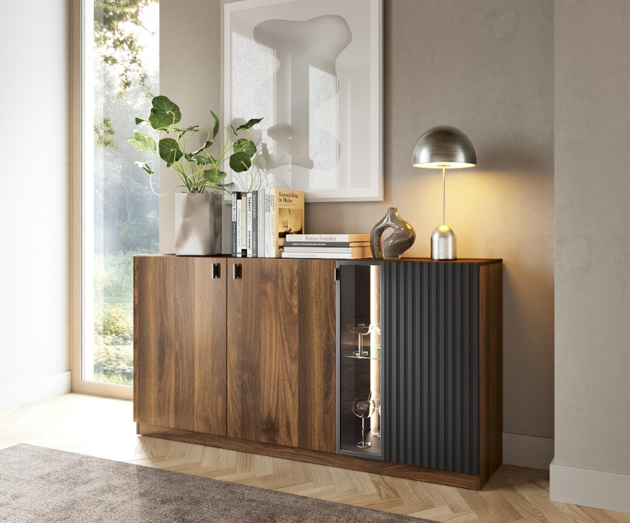 Komoda RADIUM 45 predstavuje ideálne spojenie moderného dizajnu, funkčnosti a komfortu pre každodenné používanie. Elegantná kombinácia dekoru orech columbia a matnej čiernej farby vytvára nadčasový vzhľad, ktorý sa hodí do moderných aj minimalistických interiérov. Komoda ponúka dostatok úložného priestoru na elektroniku, knihy, dekorácie aj bežné drobnosti. Integrované LED osvetlenie vytvára príjemnú atmosféru. Komfort používania zvyšuje soft-close systém, ktorý zabezpečuje tiché a plynulé zatváranie dvierok.