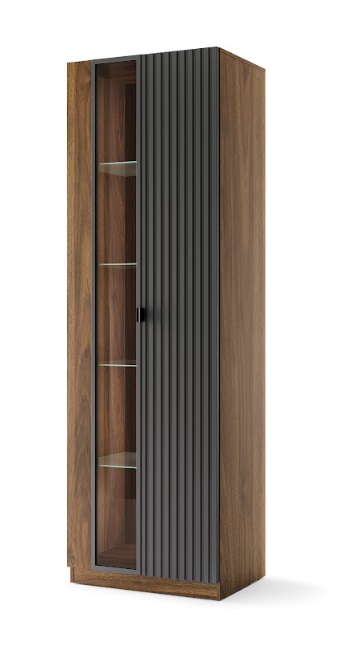 Vitrína RADIUM 11 predstavuje ideálne spojenie moderného dizajnu, funkčnosti a komfortu pre každodenné používanie. Elegantná kombinácia dekoru orech columbia a matnej čiernej farby vytvára nadčasový vzhľad, ktorý sa hodí do moderných aj minimalistických interiérov. Vitrína ponúka dostatok úložného priestoru na elektroniku, knihy, dekorácie aj bežné drobnosti. Integrované LED osvetlenie vytvára príjemnú atmosféru. Komfort používania zvyšuje soft-close systém, ktorý zabezpečuje tiché a plynulé zatváranie dvierok.