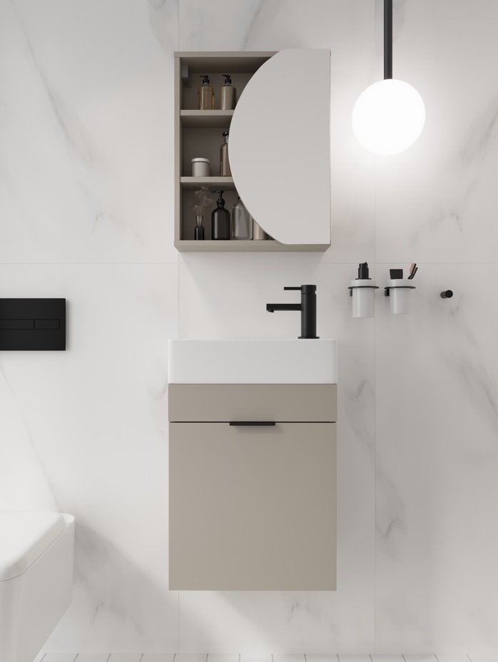 Kúpeľňová zrkadlová skrinka NANCY prináša dokonalú harmóniu moderného štýlu a prirodzenej elegancie. Povrchová úprava v odtieni cashmere dodáva sviežosť, ľahkosť a čistotu, čím sa stáva ideálnou voľbou pre tých, ktorí ocenia kombináciu estetiky, praktickosti a nadčasového dizajnu. Kúpeľňová skrinka má jedny dvierka zrkadlové a police.