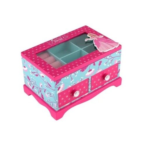 Šperkovnica je ideálnym miestom na uloženie pokladov každej malej parádnice. Krabička je vyrobená z dreva a doplnená skleneným vekom, vďaka čomu sú tie najkrajšie šperky vystavené na obdiv. Ďalším úložným priestorom sú dve menšie zásuvky na odloženie suvenírov a ďalších drobností. Šperkovnica má v podklade svetlomodrú farbu s krásnym motívom kvietkov. Sklenené ružové veko zdobené kvietkami a princeznou.