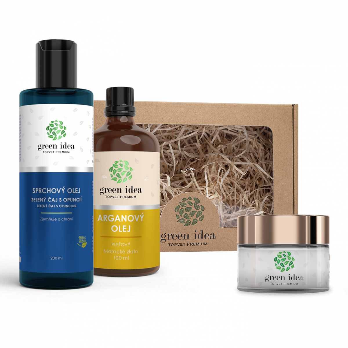 Urobte radosť milovanej mamičke, babičke alebo kamarátke. S darčekovými setmi kozmetiky a doplnkov stravy Green Idea vykúzlite úsmev na tvári každej ženy milujúcej čistú starostlivosť využívajúcu silu rastlín.Darčeková sada Pre ňu obsahuje:ASTAXANTHIN – aktívny pleťový krém, 50 mlAktívny pleťový krém s astaxantínom zo sladkovodných rias. Astaxantín je jedným z najsilnejších prírodných antioxidantov. Vďaka tomu krém plní nielen funkciu bariérovej ochrany pokožky, ale aj aktívne pôsobí proti vonkajším vplyvom prostredia. Krém tiež pleť hydratuje, regeneruje a tlmí prejavy jej starnutia. Pokožka zostáva mladistvá a zdravá.Astaxantín krém je vhodné užívať v kombinácii s kapsulami Astaxantín pre znateľnejšie výsledky.Sprchový olej, 200 mlSprchový olej jemne a šetrne odstraňuje nečistoty z pokožky bez jej vysúšania, preto je vhodný aj na citlivú, suchú a podráždenú pleť. Olej zanecháva na pokožke ochranný film, ktorý posilňuje jej bariérovú funkciu a pomáha udržať jej prirodzenú hydratáciu. Vďaka vysokej koncentrácii ošetrujúcich a čistiacich látok stačí aplikovať malé množstvo oleja. Základnou zložkou je olej z hroznových jadier, ktorý pokožku zjemňuje, vyživuje a ochraňuje. Sprchový olej Zelený čaj s opunciou zanecháva na tele sviežu, povzbudzujúcu a harmonickú vôňu, ktorá prebudí vaše zmysly.Arganový pleťový olej, 100 mlArganový olej je pre svoje výnimočné vlastnosti často nazývaný marockým zlatom. Patrí medzi najluxusnejšie a zároveň najdrahšie kozmetické oleje sveta. Arganový olej je bohatým zdrojom nenasýtených mastných kyselín, antioxidantov, vitamínov a fytosterolov. Olej je vhodné použiť na citlivú, suchú a ekzematickú pokožku. Redukuje výskyt vrások, hydratuje a pomáha udržať pokožke mladistvý vzhľad. Odporúčame tiež votrieť niekoľko kvapiek na zlepšenie kvality vlasov (na suché, poškodené a rozstrapkané vlasy).