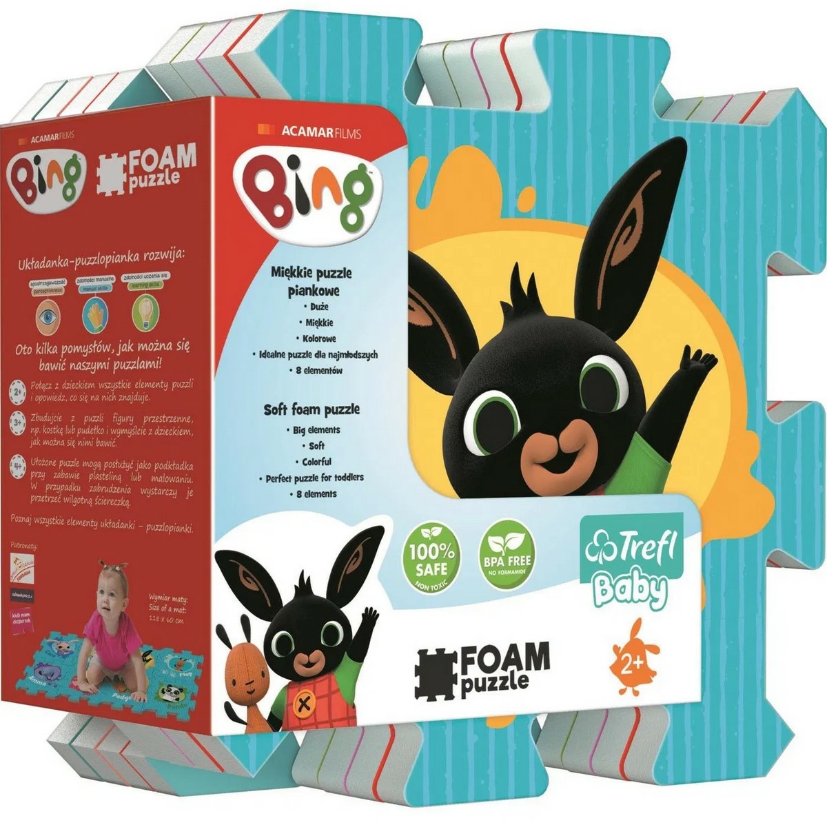 Penové puzzle s obľúbenou animovanou postavičkou zajačik Bing sa postará o kvalitnú zábavu detí a môžete ho využiť aj ako ozdobu detskej izby. Mladším deťom sa bude hodiť ako podložka na hranie. Staršie deti si vďaka nemu budú cvičiť jemnú motoriku a myslenie. Balenie obsahuje 8 dielikov. Je vhodný pre chlapcov aj dievčatá. Puzzle je vyrobené z kvalitnej nezávadnej peny. Veľkosť jedného dielika je 32 × 32 cm.