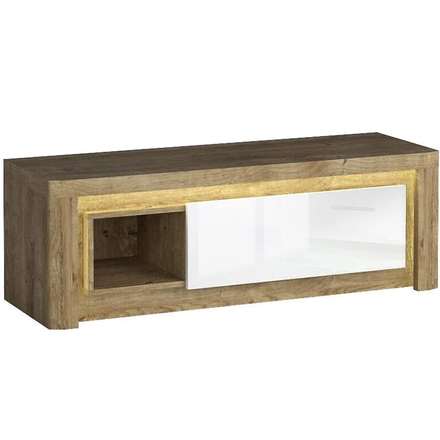 Malá RTV skrinka pod TV, do bytu, kde nemáme veľa miesta. Moderná, v krásnej, prírodnej farbe. Kombinácia farby dreva ribbeck a bielej v podobe lesklých čiel. Spolu vytvárajú úžasný efekt. Je to perfektný kus nábytku ako stvorený do obývačky. Za bielymi dvierkami vpravo bude miesto na zatvorenie niektorých vecí a tiež polička, na ktorú môžeme umiestniť satelitný TV set-top box. Máme aj osvetlenie, ktoré je súčasťou sady. Môžu byť namontované tak, že horná časť skrinky a boky budú osvetlené.