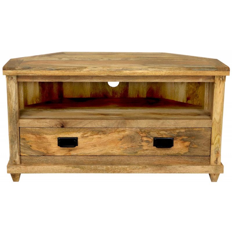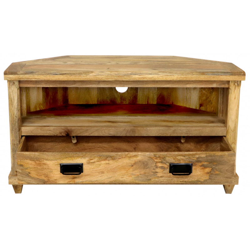 TV stolík rohový z masívu Devi je vyrobený z kvalitného masívneho mangového dreva.TV stolík rohový je vyrobený z masívu mango, má zásuvku s kovovými úchytmi a odkladací priestor na elektroniku. TV stolíky z masívu, ktoré máme skladom, si môžete pozrieť v našom showroome. Indický koloniálny nábytok mango masív.