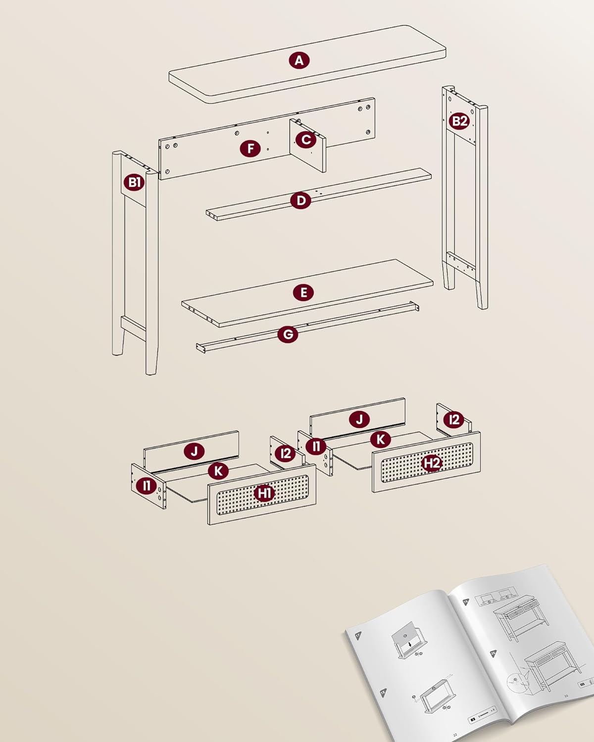 Predsieňový stolík ponúka veľkú hornú dosku na často používané predmety alebo dekorácie, 2 priestranné zásuvky na odkladanie drobných predmetov, ktoré nie sú vidieť, a otvorenú spodnú poličku na prehľadné uloženie topánok alebo veľkých predmetov, napríklad úložných košov.