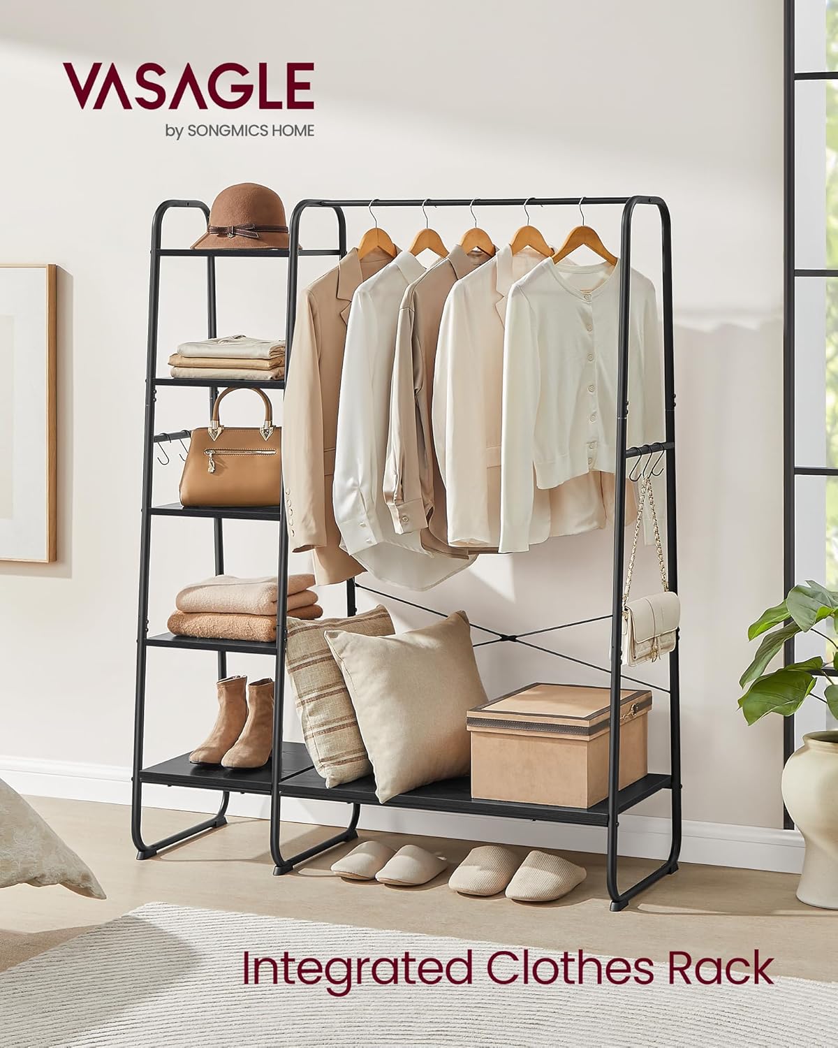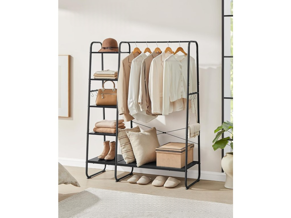 VASAGLE Kovový vešiak na oblečenie s 5+1 policami čierny