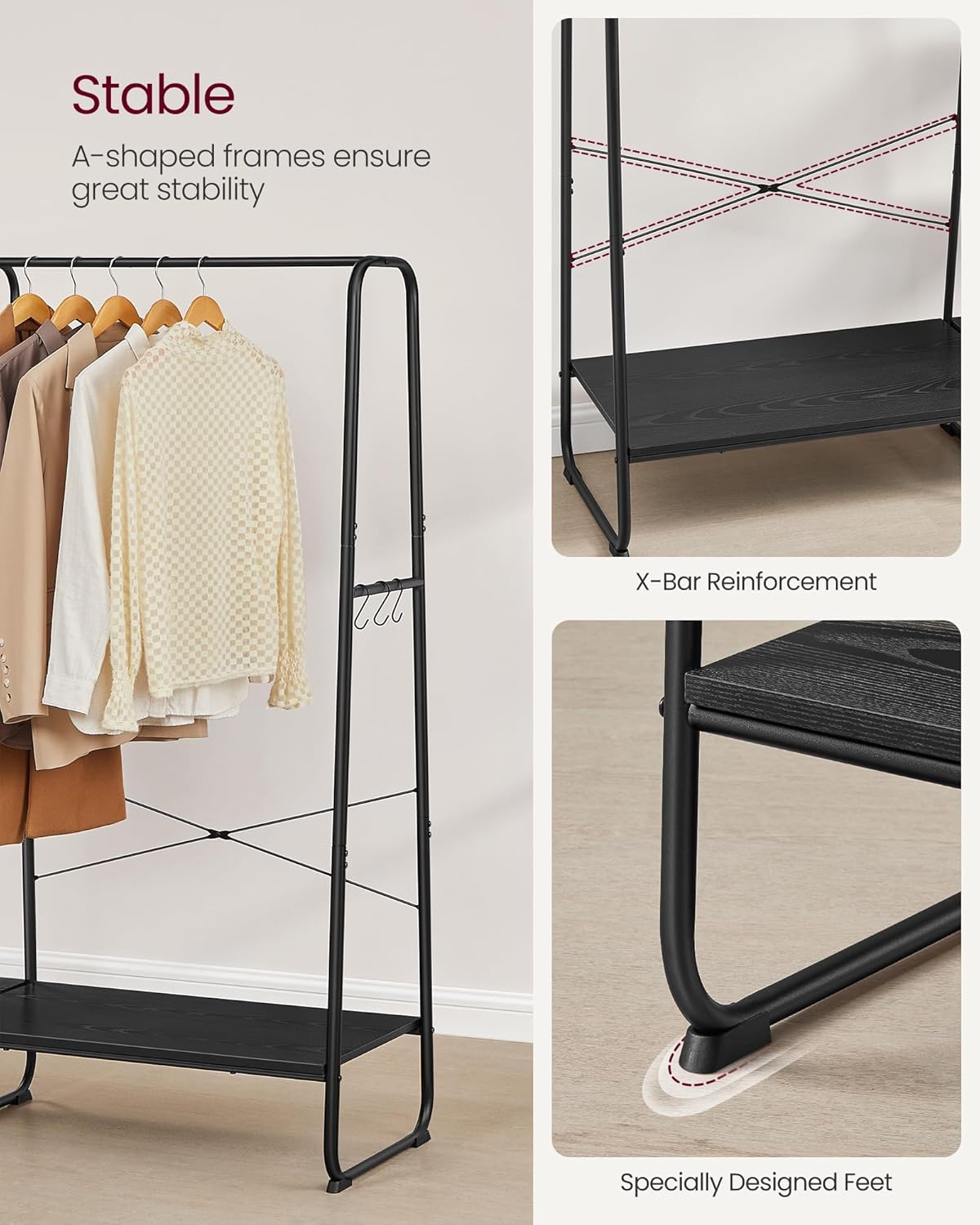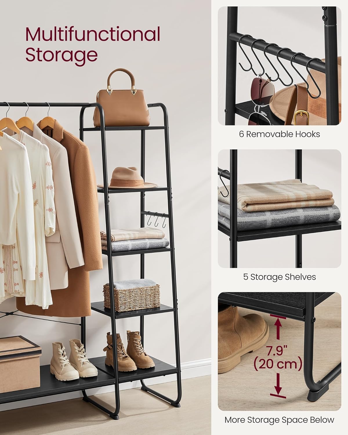 Vešiak na oblečenie kombinuje závesnú tyč, policu na topánky, 5 úložných políc a 6 bočných háčikov v tvare písmena S v jednom, aby poskytol vášmu oblečeniu, topánkam, taškám, dekoráciám a rastlinám dokonalé útočisko.