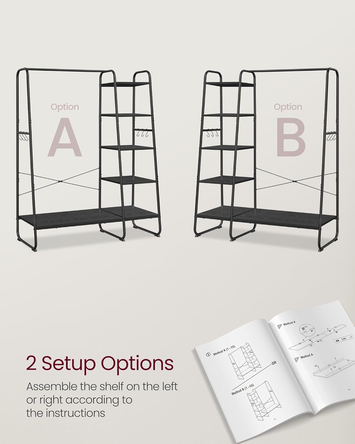 Podľa svojich potrieb môžete nainštalovať 5 úložných políc na ľavú alebo pravú stranu koľajnice na oblečenie a používať vešiak v spálni, predsieni, obývačke alebo kdekoľvek, kde je potrebný úložný priestor.