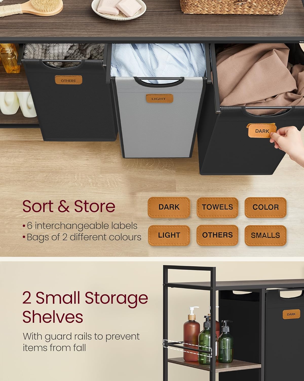 Vďaka 6 štítkom, ktoré sú súčasťou balenia, môžete bielizeň jednoducho roztriediť. Štítky sa ľahko pripevňujú pomocou háčikov a pútok a rôznofarebné koše na bielizeň uľahčujú triedenie.