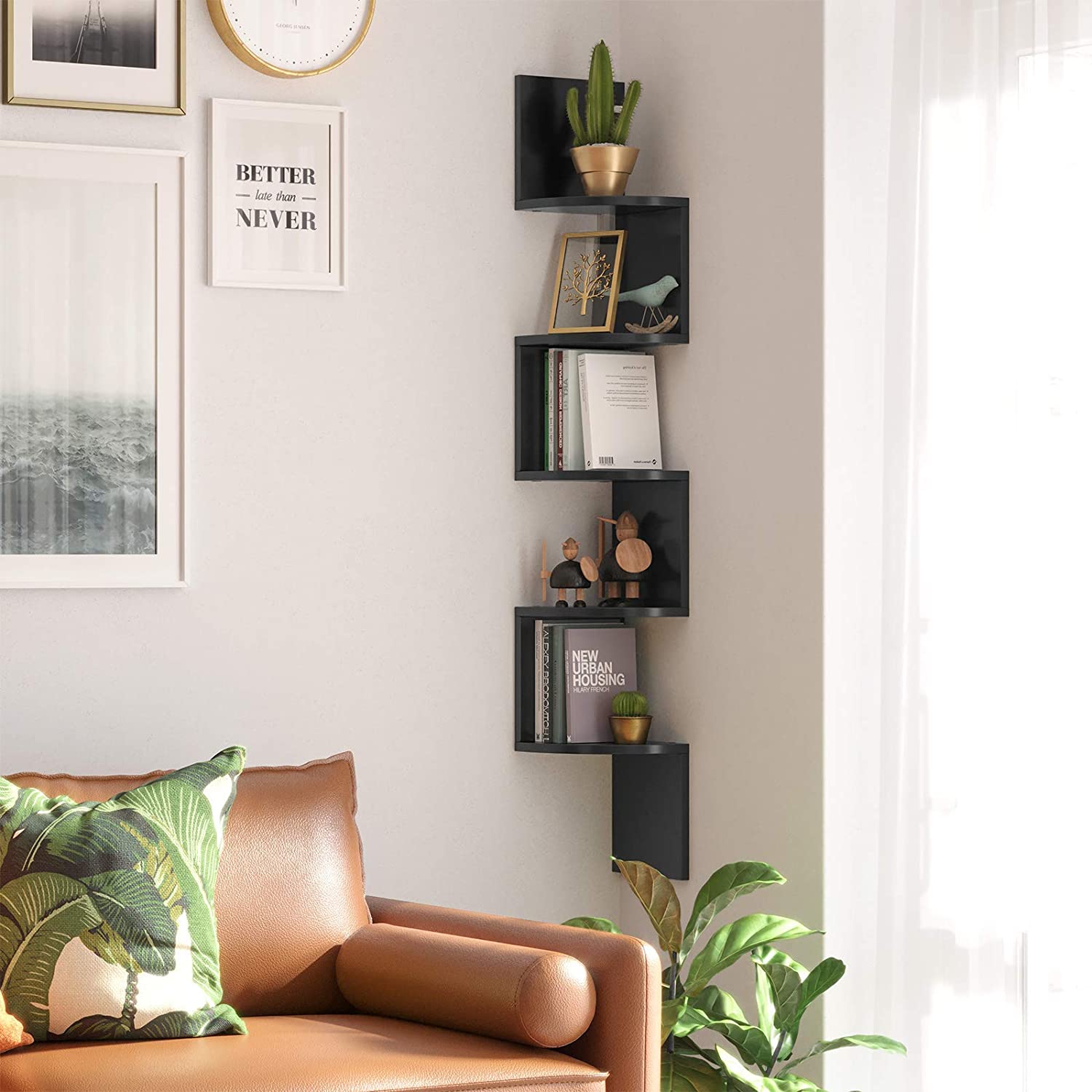 Využite rohy miestnosti na usporiadanie kníh alebo vystavenie obľúbených dekoratívnych predmetov v tejto elegantnej rohovej knižnici.