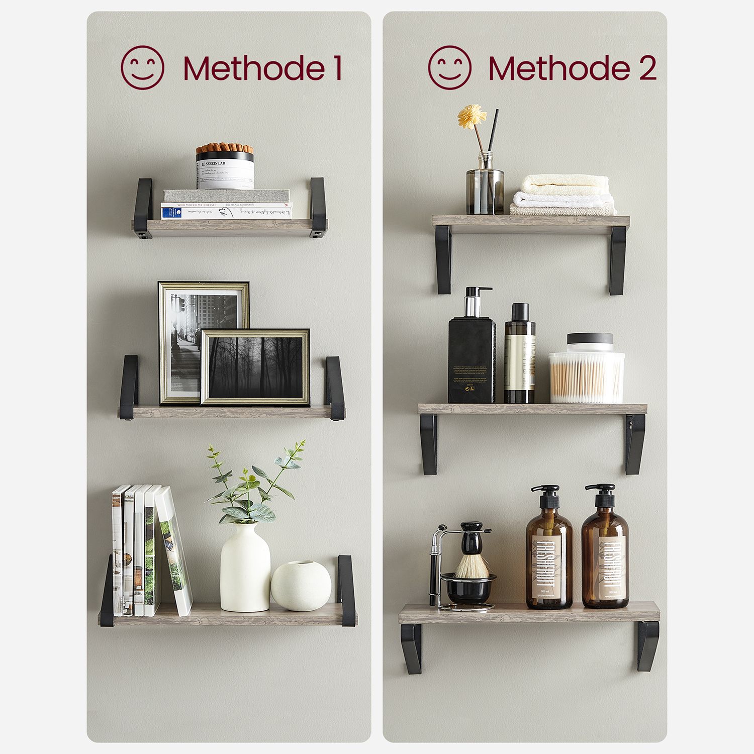 Tieto plávajúce police môžete pomocou čiernych konzol namontovať hore alebo dole. Dve možnosti montáže vám poskytujú viac možností na rozvinutie vašej kreativity.