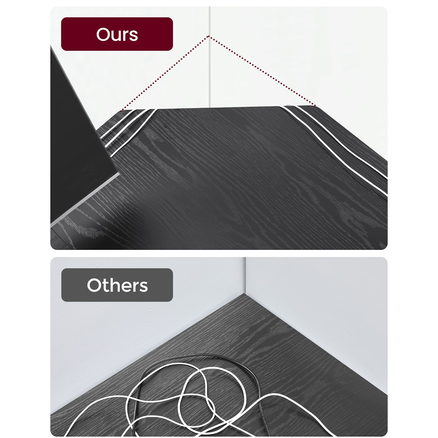 Zadný roh tohto písacieho stola do tvaru L je skosený, aby umožnil priechod káblov, čo vám pomôže spravovať káble od elektroniky a udrží váš pracovný priestor nepreplnený a estetický.