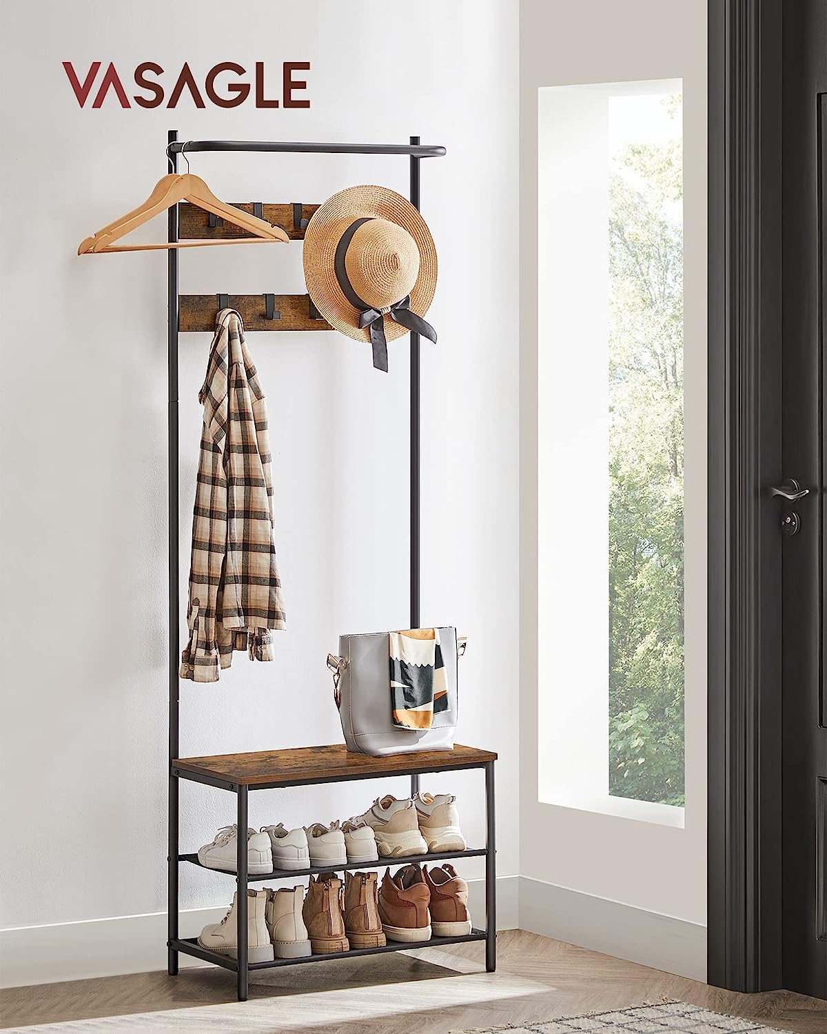 VASAGLE Botník s vešiakom priemyselný 80×31,5×183,5cm čiernohnedý