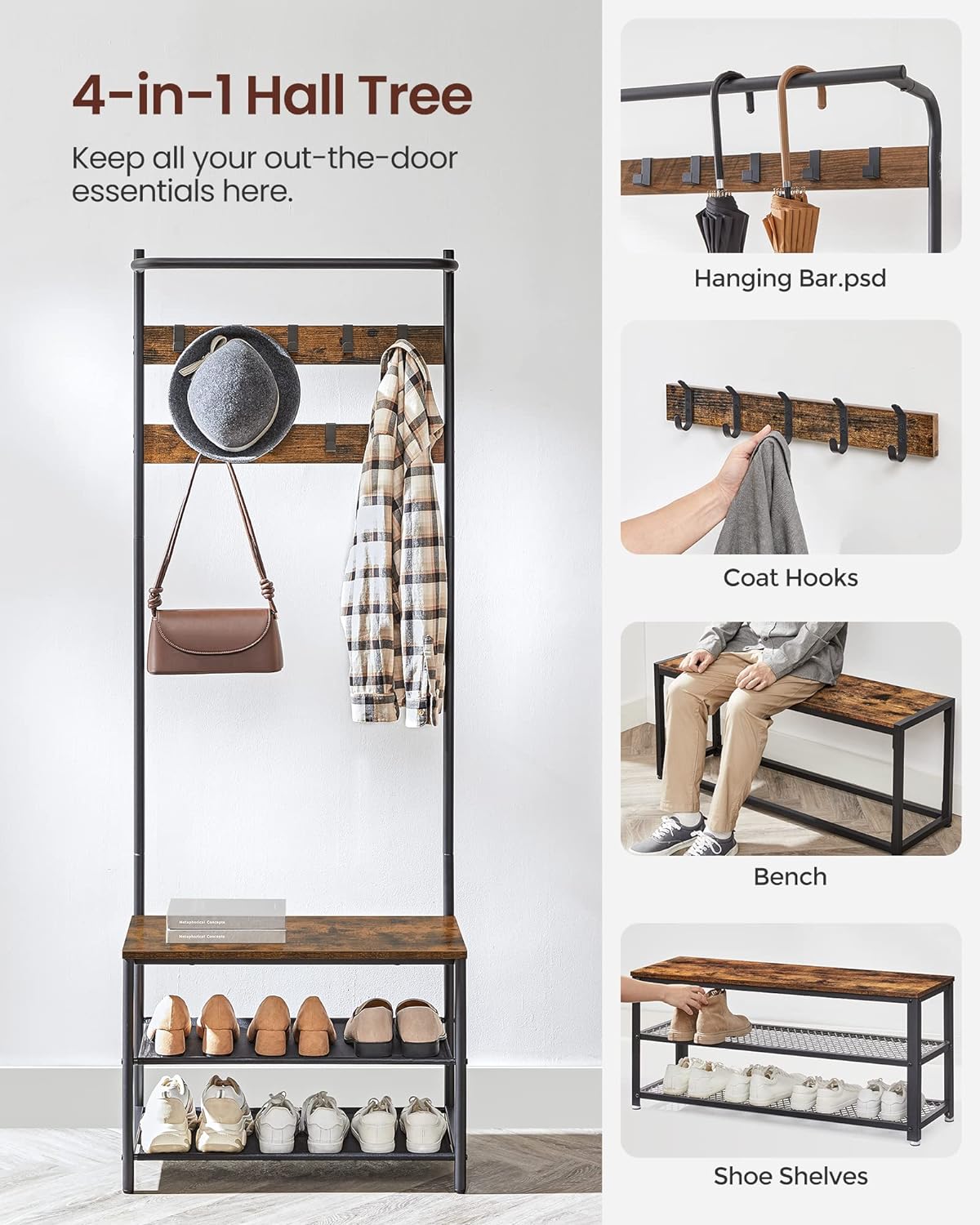 Tento vešiak na kabáty s konzolou, 9 háčikmi, 2 priestrannými stojanmi na topánky a pohodlnou lavičkou je navrhnutý tak, aby vám uľahčil život a urobil ho organizovanejším.