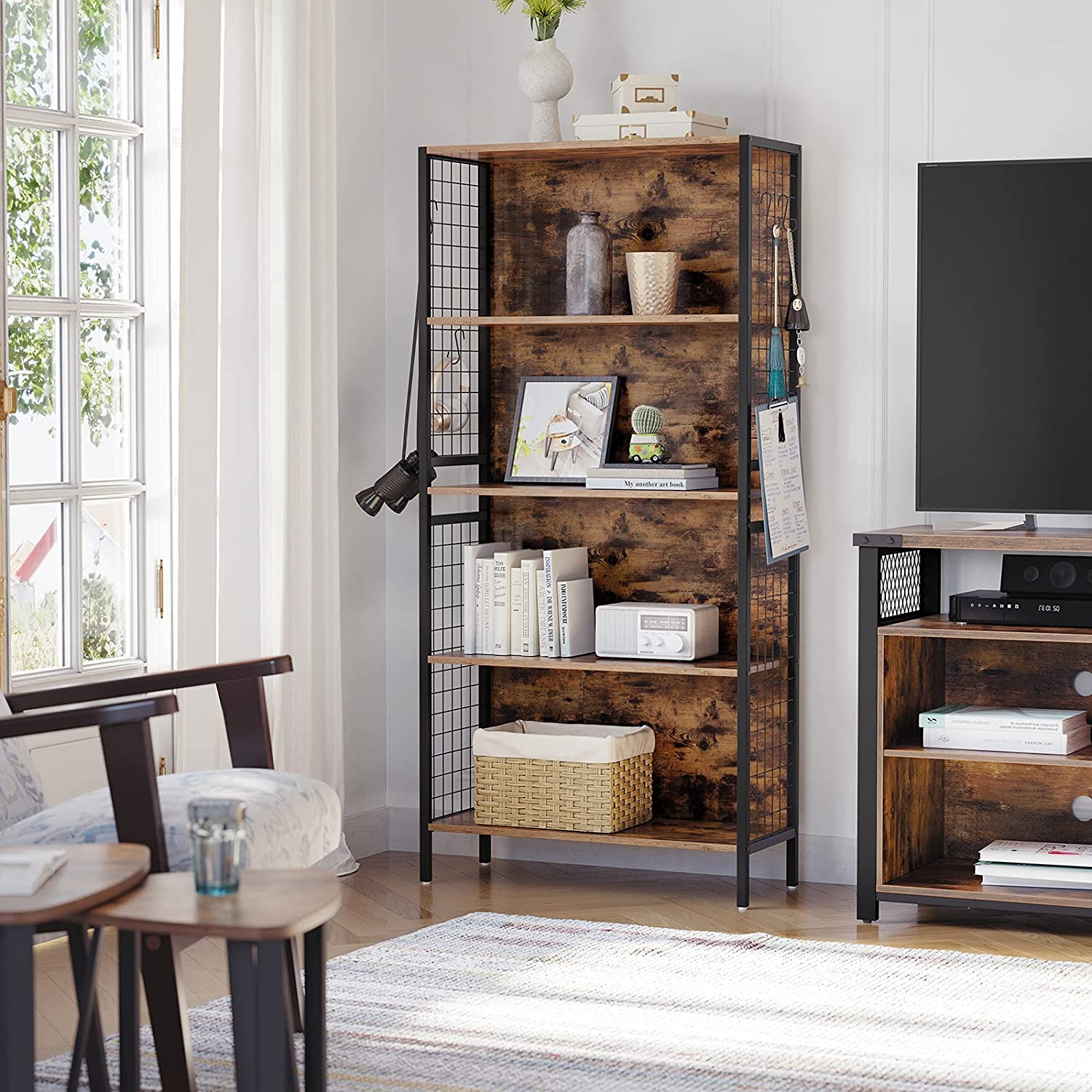 Táto knižnica kombinuje elegantné matné čierne línie, svieži dizajn mriežky a rustikálne hnedé police – to všetko dodá vášmu priestoru príjemný nádych.