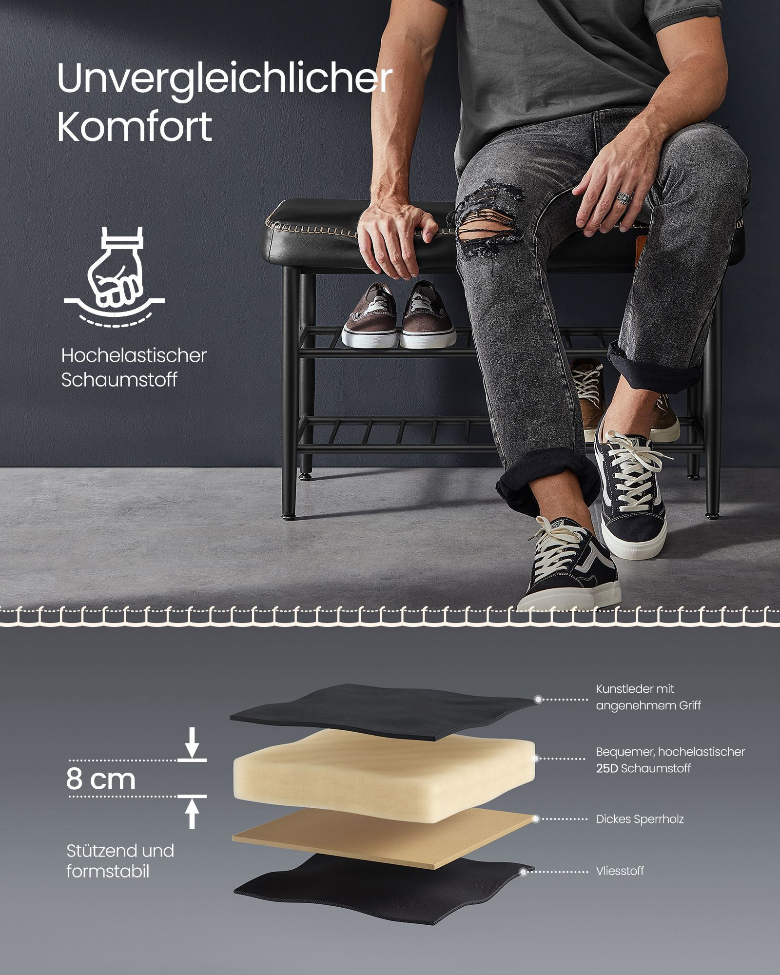 Kolekcia EKHO od spoločnosti VASAGLE kombinuje umelú kožu s jemným prešívaním, čím vytvára elegantný a moderný vzhľad. Dobre polstrované sedadlo tohto botníka poskytuje dokonalú rovnováhu medzi napätím a plnosťou, pričom zaisťuje bezpečnosť.