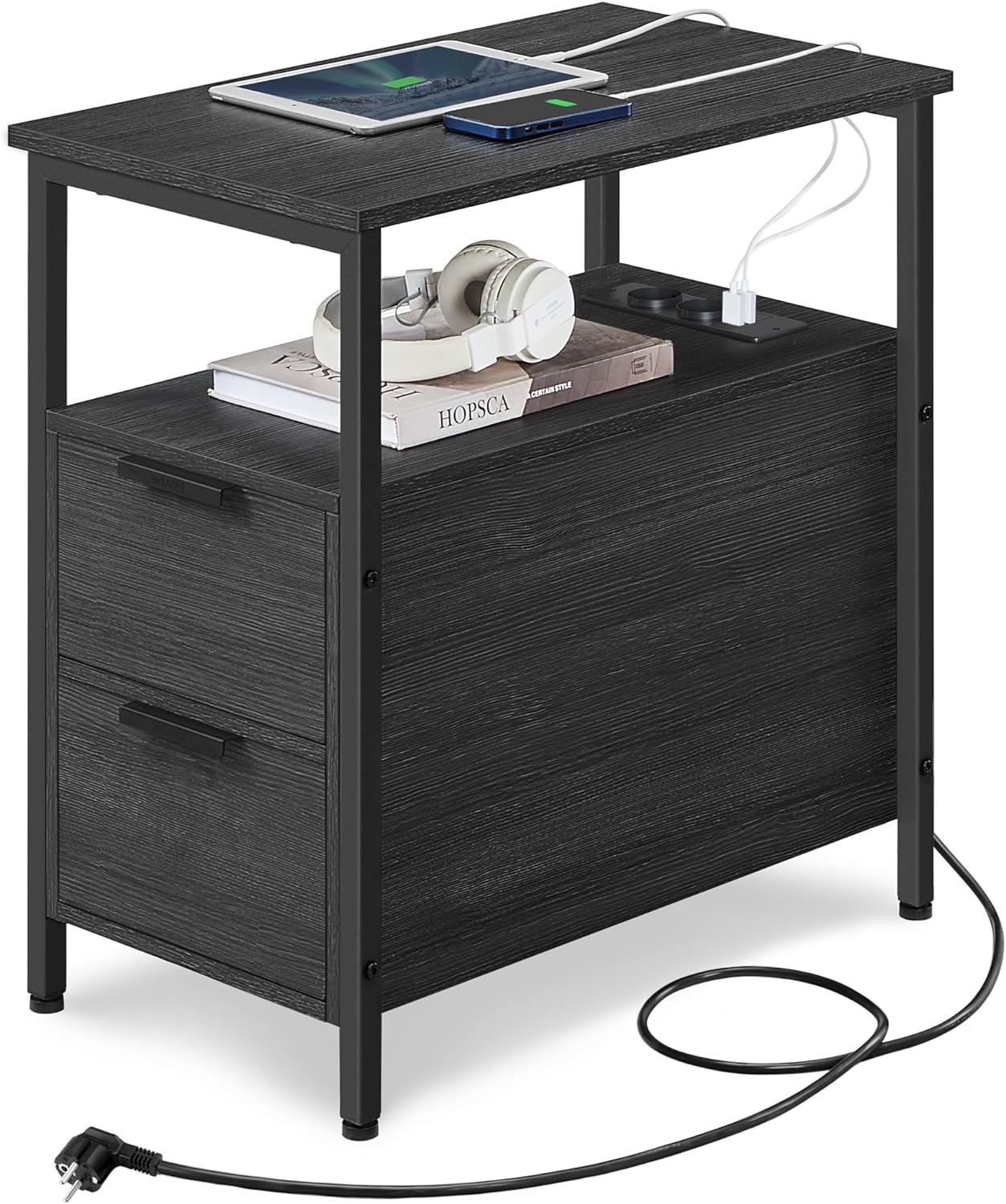 Viacúčelový odkladací stolík s elektrickou zásuvkou v elegantnej čiernej farbe mení pravidlá hry. Vďaka zabudovanej elektrickej lište a dvom priestranným zásuvkám slúži tento nočný stolík ako nabíjacia stanica a úložný priestor. Rozlúčte sa s neprehľadnými káblami a privítajte organizovanú blaženosť!