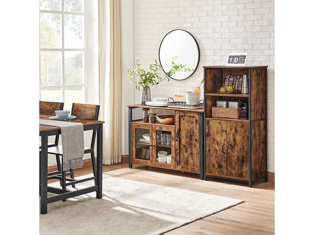 Je vyrobený z čierneho oceľového rámu, kvalitných MDF dosiek v dekore rustikálnej hnedej farby a čírou sklenenou výplňou.
