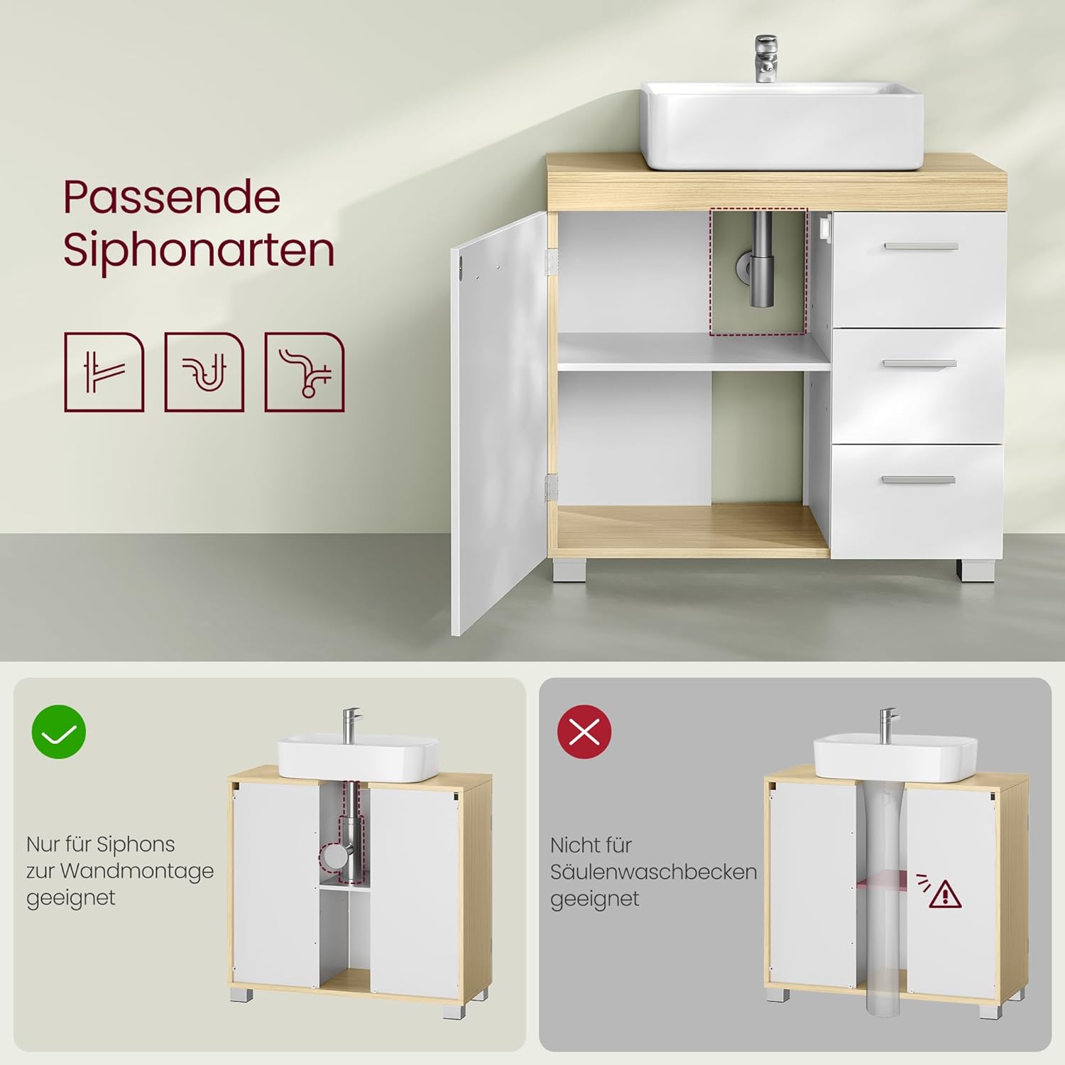 Vezmite prosím do úvahy rozmery skrinky, výrez pre sifón a vzdialenosť medzi nastaviteľnou policou a základňou, aby ste sa uistili, že základná skrinka pasuje. Nevhodné pre umývadlá s umývadlovým stĺpikom