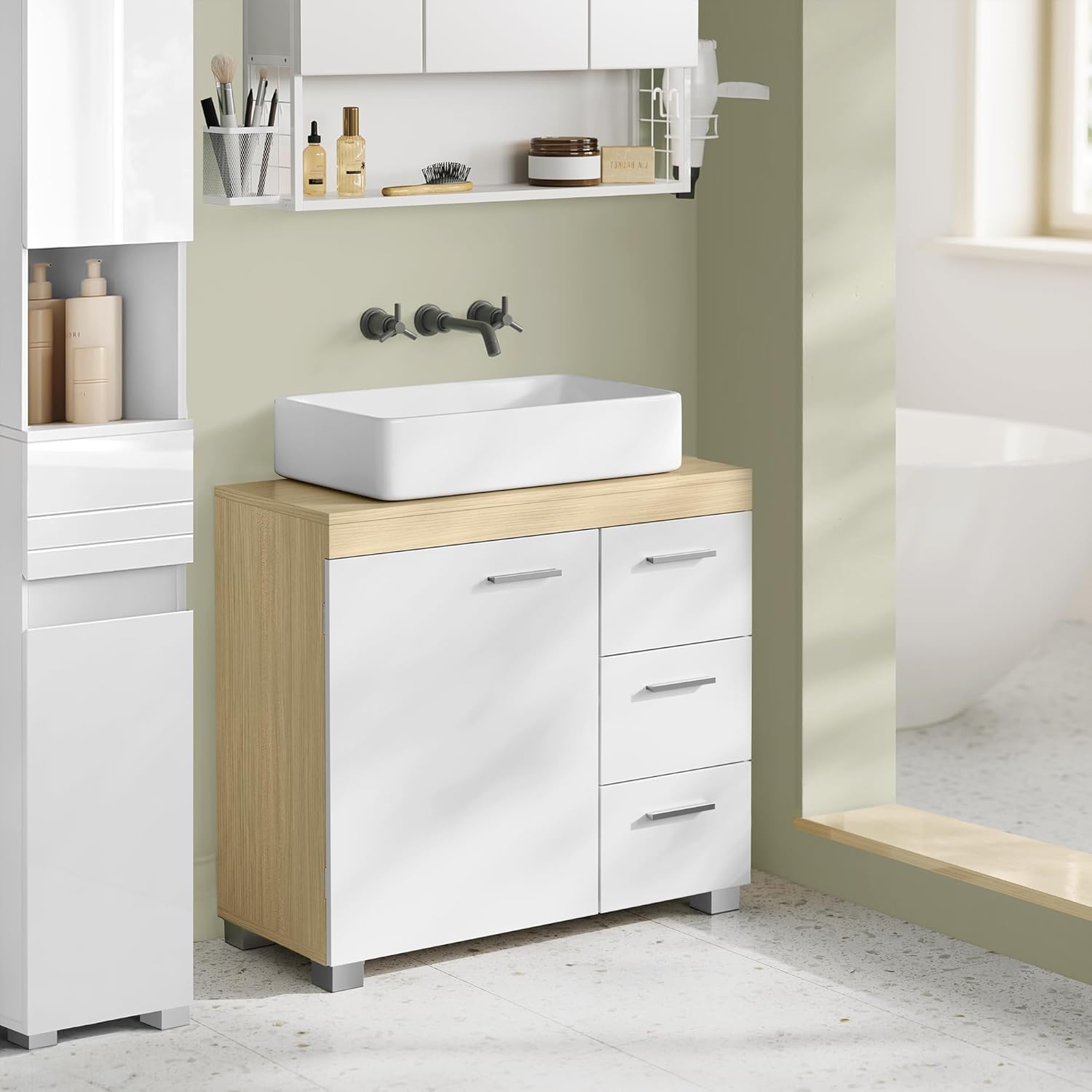 3 veľké zásuvky na boku, 2 priehradky za dvierkami skrinky – táto skrinka pod umývadlo vám poskytne dostatok úložného priestoru na prehľadné uloženie kúpeľňových potrieb, uterákov atď.
