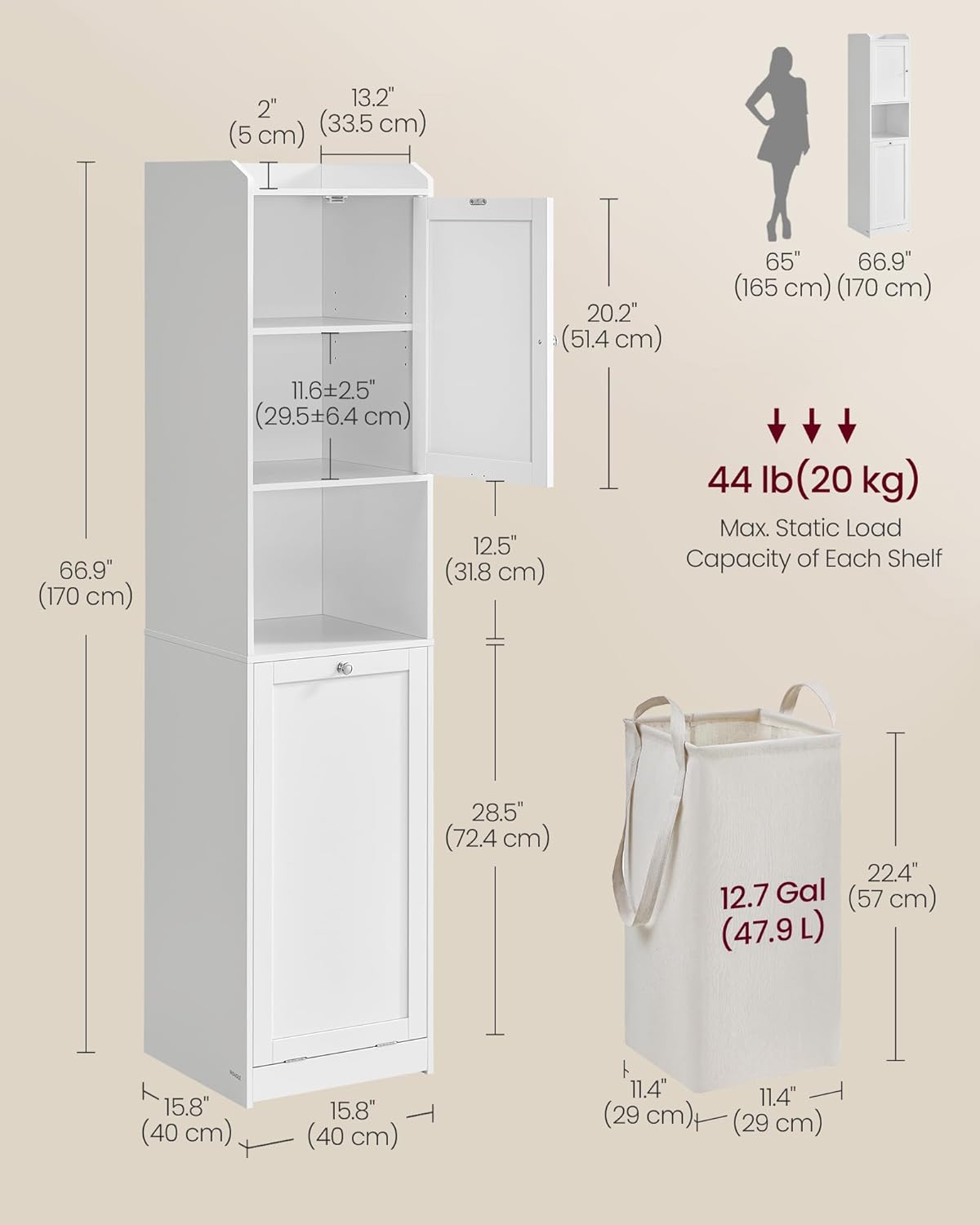 VASAGLE Vysoká kúpeľňová skrinka s výklopným košom na bielizeň biela