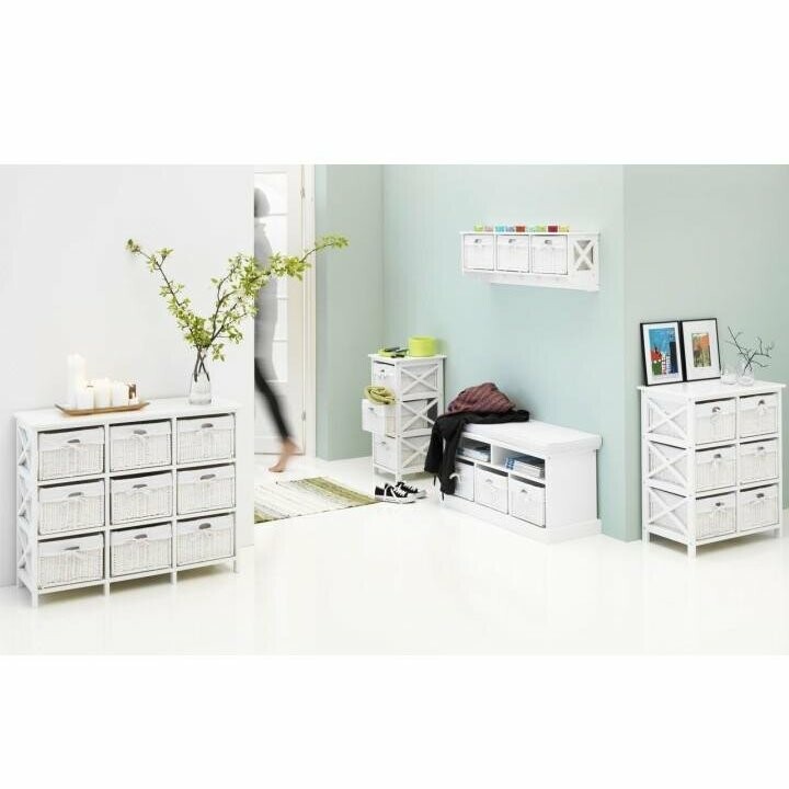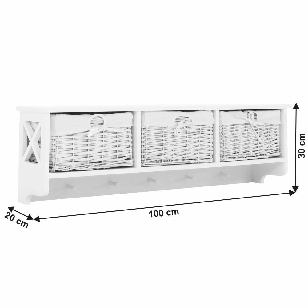 Vešiaková polica s košíkmi RAFAELLO v bielej farbe je štýlovým a funkčným doplnkom, ktorý vnesie do vašej predsiene poriadok aj nádych elegancie. Spojenie dreva a prútia pôsobí útulne a zároveň nadčasovo, takže sa hodí ako do moderných interiérov, tak aj do vidieckeho či provence štýlu. Biely dekor opticky rozjasní priestor a dodá mu ľahkosť, vďaka čomu sa polica stane nielen praktickým, ale aj dekoratívnym prvkom.Tento model ponúka kombináciu niekoľkých funkcií v jednom. V hornej časti sa nachádzajú odkladacie police a prútené košíky, ktoré sú ideálne na uloženie drobností, šálov, rukavíc alebo kľúčov. Dolná časť je vybavená háčikmi, na ktoré pohodlne zavesíte kabáty, bundy, tašky alebo doplnky. Vďaka premyslenému usporiadaniu budete mať všetky veci po ruke a zároveň prehľadne usporiadané.Praktické prevedenie v kombinácii s pevnými materiálmi zaručuje dlhú životnosť a spoľahlivé používanie. Montáž je jednoduchá a rýchla, takže policu ľahko pripevníte na stenu. Vešiaková polica RAFAELLO je ideálnou voľbou pre tých, ktorí chcú mať predsieň nielen usporiadanú, ale aj esteticky zladenú.