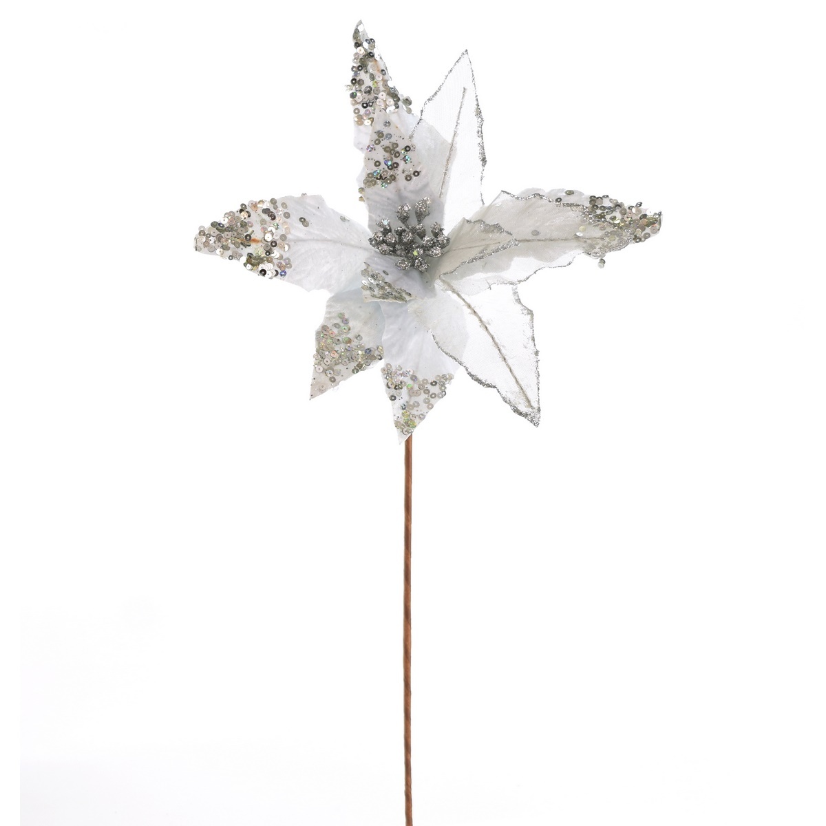 Táto krásna kvetina bude vyzerať skvele vo váze aj ako prízdoba na vianočnom venci. Niektoré z lístkov sú zdobené striebornými trblietkami.