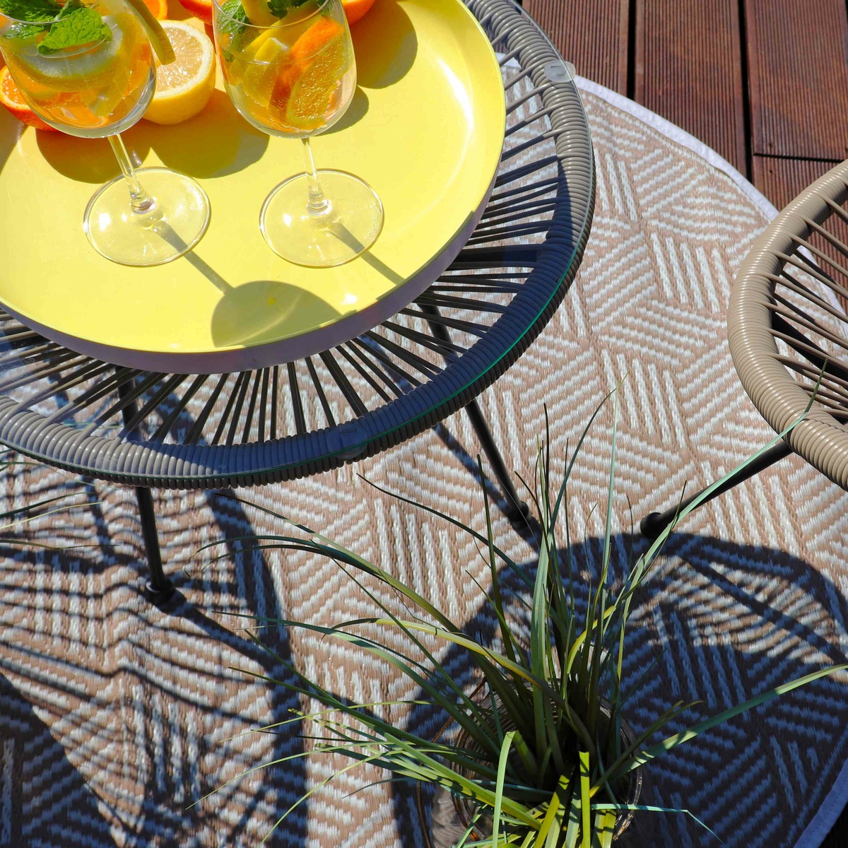 Dekoratívny koberec je ideálny na použitie hlavne vo vonkajších priestoroch, ako sú terasy alebo balkóny. Je vyrobený z vysoko kvalitného polypropylénu, ktorý sa vyznačuje dlhou životnosťou. Originálny vzor veľmi zapadne do vášho interiéru. Koberec je vhodný na akékoľvek povrchy.